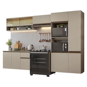 A Cozinha Completa de 300 cm é ideal para quem busca praticidade. O destaque vai para o paneleiro com duas portas e cinco nichos. Os módulos são suspensos, garantindo um visual leve e facilitando a limpeza.