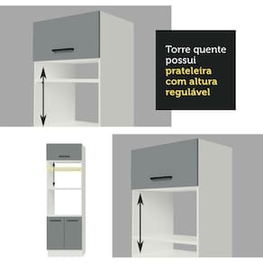 O acabamento da estrutura é branco e o das portas e frentes é cinza. É feito em Pintura Poliéster, com 7 camadas de proteção resistentes a álcool, água e calor.