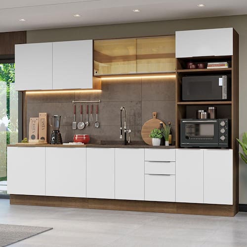 O conjunto é composto por módulos avulsos, que podem ser personalizados de acordo com o tamanho e a configuração do seu espaço. Isso permite que você crie uma cozinha planejada, que atenda às suas necessidades.