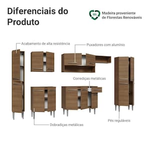 A linha Emilly se destaca pelo acabamento de alta resistência, puxadores em alumínio, corrediças e dobradiças metálicas, garantindo durabilidade no uso diário. Os pés reguláveis proporcionam estabilidade e facilitam a limpeza. O acabamento em tom amadeirado Rustic traz um toque aconchegante para a sua cozinha.