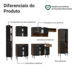A linha Emilly se destaca pelo acabamento de alta resistência, puxadores em alumínio, corrediças e dobradiças metálicas, garantindo durabilidade no uso diário. Os pés reguláveis proporcionam estabilidade e facilitam a limpeza. A combinação do amadeirado Rustic e Preto valoriza o ambiente com estilo e personalidade.