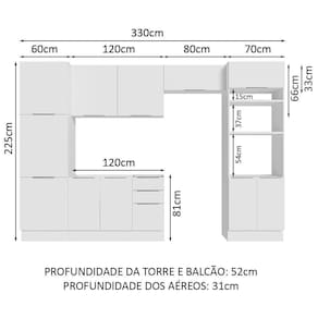 - 52 cm de profundidade no balcão e nas torres e 31 cm nos aéreos