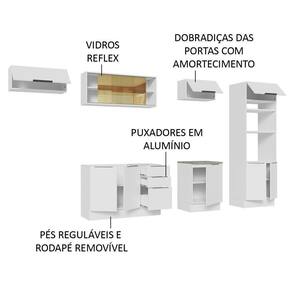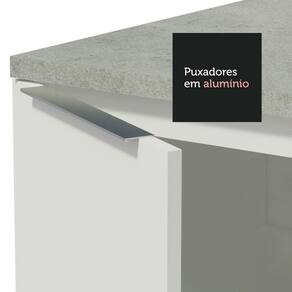 Possui puxadores em alumínio no modelo slim, gavetas com corrediças telescópicas de abertura total e portas com amortecimento para fechamento suave. Além disso, os pés são reguláveis em PVC, com rodapé removível de MDP.