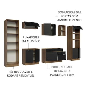 É um móvel de qualidade superior, sendo composta por puxadores com alça em alumínio, gavetas com corrediças telescópicas de abertura total, portas com amortecimento para fechamento suave, pistão a gás nas portas basculantes e pés reguláveis em PVC com rodapé em MDP.