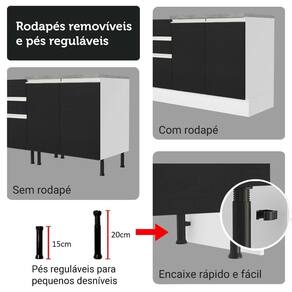 O móvel é equipado com puxadores em alumínio e gavetas com corrediças telescópicas, que abrem totalmente. Já as portas possuem amortecimento, proporcionando um fechamento suave, enquanto os pés em PVC contam com regulagem de altura.