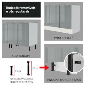 Composta por materiais de muita qualidade, a cozinha possui puxadores em alumínio, gavetas com corrediças telescópicas, amortecedores para o fechamento suave das portas, pistão a gás para a abertura das portas basculantes e pés reguláveis em PVC, com rodapés removíveis em MDP.