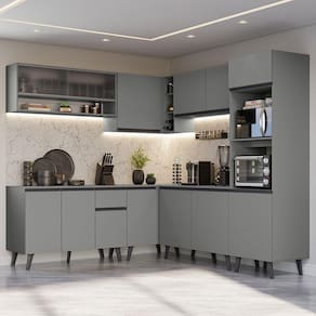 Com design moderno e muito conforto, o Armário de Cozinha Completa de Canto da linha Nice da Madesa vai fazer você amar a sua casa! A qualidade na construção e nos materiais utilizados é um dos grandes diferenciais desta cozinha. Ela conta com puxadores em alumínio na coloração titanium, corrediças telescópicas para abertura total da gaveta, dobradiças metálicas nas portas e vidro no estilo pontilhado em um dos aéreos.