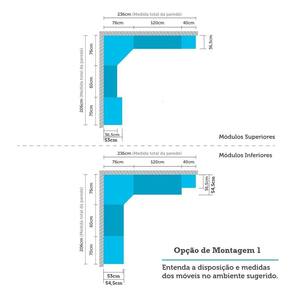 Medidas Gerais do Ambiente: Opção de montagem 1: 220 x 206 e 236 x 54,5 -Altura x Largura 1 e Largura 2 x Profundidade Maior - cm- Opção de montagem 2: 220 x 146 e 296 x 54,5 -Altura x Largura 1 e Largura 2 x Profundidade Maior - cm-