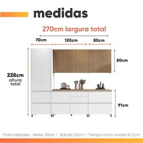Importante sobre a entrega: A entrega é realizada até a portaria ou porta de entrada do endereço indicado, desde que o acesso seja permitido. Para locais com portaria, a entrega será feita no piso térreo. Não realizamos montagem, desmontagem, transporte por escadas ou içamento. É responsabilidade do cliente verificar se as dimensões do produto são compatíveis com portas, elevadores e corredores. Evite imprevistos: confira todos os detalhes antes de concluir sua compra. MEDIDAS ARMÁRIO:: A = 228 cm (com pés) L = 270 cm P = 52 cm | ALTURA PÉS:: A = 10 cm | PRATELEIRAS SUPORTAM ATÉ:: 15 kg | GAVETAS SUPORTAM ATÉ:: 10 kg | TAMPO SUPORTA ATÉ:: 30 kg | PESO:: 233,1 kg | MODELO:: Armário De Cozinha Completa 8 Portas 7 Gavetas 100% Mdf Raissa Nesher | MARCA:: Nesher | MATERIAL:: MDF | ESPESSURA DO MATERIAL:: 15 mm | ACABAMENTO:: Fosco | TIPO DE PORTA:: Bater / Basculantes | PISTÃO A GÁS:: Sim | CORREDIÇAS:: Telescópicas (3 estágios) | PESO SUPORTADO:: 255 kg | PORTAS:: 8 | PRATELEIRAS:: 11 | PINTURA:: UV de alta qualidade | DOBRADIÇAS:: Slow Motion | GAVETAS:: 7 | PUXADORES:: Cava | MATERIAL DO TAMPO:: MDF | ESPESSURA DO TAMPO:: 30 mm | PÉS:: 13 (reguláveis) | MATERIAL DOS PÉS:: Plástico | INSTRUÇÕES E CUIDADOS:: Para maior durabilidade, recomendável que a limpeza dos móveis seja feita com pano limpo e seco. Não usar produtos químicos ou abrasivos | GARANTIA:: 3 meses pelo fabricante. | AVISO:: Importante sobre a entrega: A entrega é realizada até a portaria ou porta de entrada do endereço indicado, desde que o acesso seja permitido. Para locais com portaria, a entrega será feita no piso térreo. Não realizamos montagem, desmontagem, transporte | SISTEMA DE MONTAGEM:: Parafusos, minifix e cavilhas | DIFERENCIAIS:: Estrutura 100% MDF / Detalhes canelados usinados / Gaveta com porta talheres e porta tempero embutidos / Amplo espaço para melhor armazenamento / Corrediças telescópicas 3 estágios / Dobradiças Slow motion / Pistão a gás / Pés reguláveis | Requer montagem: Sim | Altura da embalagem: 95 cm | Comprimento da embalagem: 224 cm | Largura da embalagem: 61 cm | Peso da embalagem: 22165 g | Tipo da embalagem: sem embalagem adicional | tipo de móveis de cozinha: Armário | Cor: Branco / Madeirado