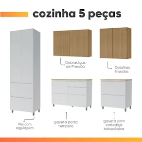 DIFERENCIAIS: Estrutura 100% MDF / Detalhes canelados usinados / Gaveta com porta talheres e porta tempero embutidos / Amplo espaço para melhor armazenamento / Corrediças telescópicas 3 estágios / Dobradiças Slow motion / Pistão a gás / Pés reguláveis / Balcões com possivel adaptação para cooktop e pia.