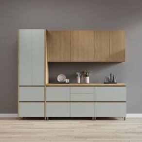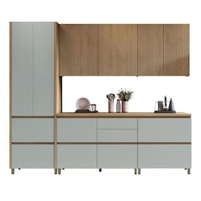 DIFERENCIAIS: Estrutura 100% MDF / Detalhes canelados usinados / Gaveta com porta talheres e porta tempero embutidos / Amplo espaço para melhor armazenamento / Corrediças telescópicas 3 estágios / Dobradiças Slow motion / Pistão a gás / Pés reguláveis / Balcões com possivel adaptação para cooktop e pia.