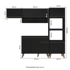 Composta por dois módulos versáteis, conta com um armário aéreo de duas portas de vidro e nicho incluso, um armário aéreo de 60cm, um balcão de 105cm com gaveteiro e uma torre quente com espaço para dois fornos. Equipada com puxadores e pés em ABS, dobradiças e corrediças metálicas e elaborada em MDP de alta qualidade, essa cozinha oferece durabilidade, resistência e sofisticação em cada detalhe!
