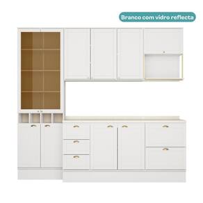 A Cozinha Milla Muse lembra as tradicionais cozinhas norte-, com detalhes especiais em frisos e puxadores porém, tudo em uma simplicidade visual. Possui 5 módulos, entre eles aéreo com 3 portas, balcão com 1200 mm, aéreo basculante de 800 mm com nicho para microondas, cristaleira e um balcão de 800 mm. Conta também com puxadores em metal no acabamento ouro velho e matéria-prima em BP e MDF, criando uma harmonia fantástica com os demais itens dentro do espaço em que a cozinha está inserida.