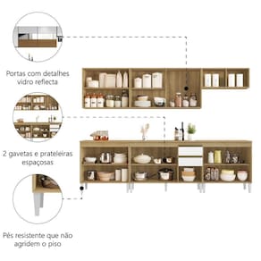 Armário De Cozinha Completa Com Balcão 12 Portas 2 Gavetas Clara Atacama / Branco Aramóveis Atacam/off O Armário de Cozinha Completa Clara possui design versátil e multifuncional, perfeito para sua cozinha ou área gourmet! Composto por um amplo armário aéreo com portas em detalhe reflecta, e armário com porta basculante com pistão a gás para melhor aproveitamento de espaço. Acompanha balcão com tampo espaçoso, ideal para quem deseja praticidade e funcionalidade em qualquer ambiente e ainda conta com pés em material resistente que não agridem o piso. MEDIDAS: [ A ] = 84 cm (Balcões) / 67 cm (Armários Aéreos) [ L ] = 258,8 cm [ P ] = 48 cm (Balcões) / 28,8 cm (Armários Aéreos) PESO: 127, 04kg ARMÁRIO AÉREO SUPORTA ATÉ: 10kg BALCÃO SUPORTA ATÉ: 35kg PESO SUPORTADO PRATELEIRAS: 5kg Características MODELO: Armário de Cozinha Completa com Balcão 12 Portas 2 Gavetas Clara Aramóveis MARCA: Aramóveis COR: Atacama / Branco MATERIAL DA ESTRUTURA: MDP ACABAMENTO: Fosco / Brilho PORTAS: 12 GAVETAS: 2 TIPO DE PORTA: Bater / Basculante (Armário Aéreo) DOBRADIÇAS: Metálicas CORREDIÇAS: Metálicas PRATELEIRAS: 11 MATERIAL DOS PUXADORES: Plástico PÉS: 13 MATERIAL DOS PÉS: Plástico TIPO DE PUXADORES: Embutidos POSSUI VIDRO: Vidro Reflecta GARANTIA: 3 meses