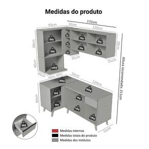 - 52 cm de profundidade nos balcões, 31 cm nos aéreos e 45 cm no nicho para micro-ondas