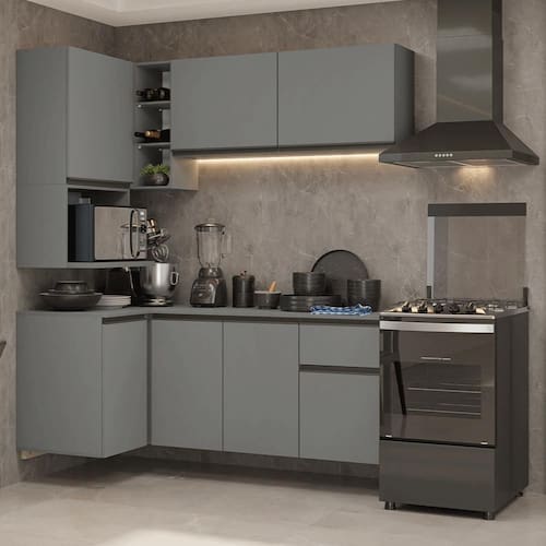 Cor: Cinza | Garantia: 3 meses contra de fabricação | Dimensões - Altura: 211 cm | Dimensões - Largura: 265 cm | Dimensões - Profundidade: 52 cm | Produto: Cozinha Completa | Marca: Madesa | Peso aproximado: 107,2 kg | Material: MDP | Estado de Origem: RS | Conteúdo da embalagem: Uma Cozinha Completa | Material para Filtro: MDP | Instruções/Cuidados: Utilize um pano limpo, levemente umedecido e seque em seguida a superfície. Não usar produtos químicos ou abrasivos para a limpeza. Recomendamos polir seu móvel com lustra-móveis duas a três vezes por ano. | Produto precisa de Montagem?: Sim | Inclui tampo: Sim | Peso Produto Com Embalagem (Kg): | Altura do Produto com Embalagem (cm): 42,6 | Largura Produto Com Embalagem (cm): 66,1 | Comprimento Produto Com Embalagem (cm): 125,7 | Descrição do Tamanho: 211 cm x 265 cm x 52 cm | Nome do Simples no Fornecedor: Armário de Cozinha Completa de Canto 265 cm Suspensa Cinza Nice Madesa 06 | Fabricante: Madesa | RBN: Casa/Móveis/Móveis para Escritório em Casa | Quantidade de Gavetas: 1 | Quantidade de portas: 7 | Tipo de móveis de cozinha: Cozinha Completa | Materiais do corpo: MDP | Quantidade de caixas de embalagem: 5 | Bullet Point 1: Dimensões: 211 cm altura x 265 cm largura x 52 cm profundidade | Bullet Point 2: Conta com puxadores em alumínio, corrediças telescópicas para abertura total das gavetas e dobradiças metálicas nas portas | Bullet Point 3: O espaço é muito bem distribuído, o que permite uma ótima organização dos utensílios, louças e eletros | Bullet Point 4: Possui acabamento de alta resistência, conservando a beleza do móvel por muito mais tempo | É Frágil: Não | Quantidade de Itens: 1 | Certificação de teste externa: Sim | Modelo: GCNC2650063B | Componentes incluídos: Portas | Precisa de baterias ou pilhas: Não | da peça (part_number): GCNC2650063B | Peso do item (item_weight): ;unit=kilograms | Dimensões do item P x L x A (item_depth_width_height): depth#value=52;depth#unit=centimeters;height#value=211;height#unit=centimeters;width#value=265;width#unit=centimeters | Requer montagem (REQUIRES_ASSEMBLY): Sim | Inclui manual de montagem (INCLUDES_ASSEMBLY_MANUAL): Sim | Inclui manual de montagem: Sim | Cor: Cinza