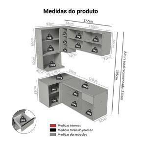 - 52 cm de profundidade nos balcões, 31 cm nos aéreos e 45 cm no nicho para micro-ondas