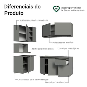 O balcão possui dobradiças metálicas nas portas e puxadores em perfil de alumínio, garantindo resistência. As gavetas possuem corrediças que permitem abertura total. O tampo é removível, possibilitando a instalação de cuba ou pedra e o acabamento é de alta resistência, garantindo durabilidade no uso diário.