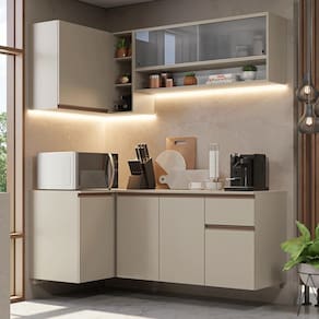 A Cozinha de Canto da linha Nice combina design moderno e soluções inteligentes. Os módulos de canto otimizam o espaço e a instalação suspensa traz um visual leve e facilita a limpeza. Os aéreos possuem diferencias que agregam sofisticação e otimizam espaço.