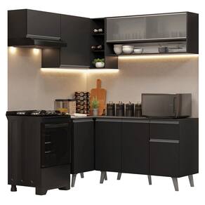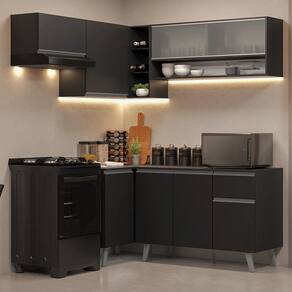 O acabamento de alta resistência no tom preto confere um visual moderno e sofisticado à cozinha. Os puxadores em cinza titanium valorizam ainda mais o ambiente.