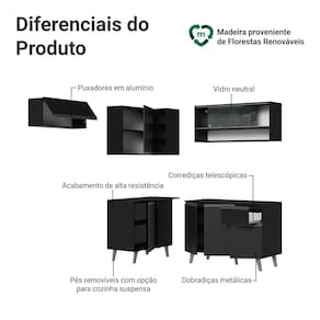 O acabamento de alta resistência no tom preto confere um visual moderno e sofisticado à cozinha. Os puxadores em cinza titanium valorizam ainda mais o ambiente.