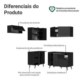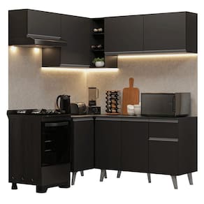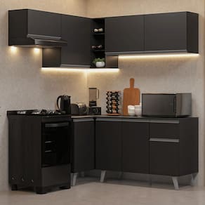 O acabamento de alta resistência no tom preto confere um visual moderno e sofisticado à cozinha. Os puxadores em cinza titanium valorizam ainda mais o ambiente.