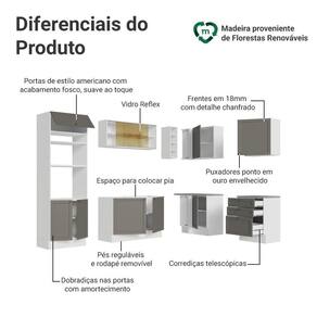 O acabamento de alta resistência da estrutura é em Branco, das frentes em Cinza e possui uma textura suave ao toque. O destaque fica por conta dos puxadores ponto em ouro envelhecido, feitos com metal resistente, trazem personalidade e um charme único. Outro diferencial está no detalhe chanfrado das frentes, que forma molduras elegantes e dá profundidade ao design.