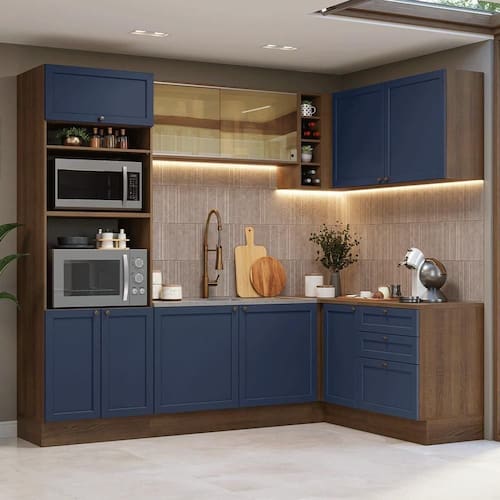 Cor: Azul | Garantia: 3 meses contra defeitos de fabricação | Dimensões - Altura: 225 cm | Dimensões - Largura: 399 cm | Dimensões - Profundidade: 52 cm | Produto: Cozinha Completa | Marca: Madesa | Peso aproximado: 208 kg | Material: MDP | Estado de Origem: RS | Conteúdo da embalagem: Uma Cozinha Completa | Material para Filtro: MDP | Instruções/Cuidados: Utilize um pano limpo, levemente umedecido e seque em seguida a superfície. Não usar produtos químicos ou abrasivos para a limpeza. Recomendamos polir seu móvel com lustra-móveis duas a três vezes por ano. | Produto precisa de Montagem?: Sim | Inclui tampo: Não | Peso Produto Com Embalagem (Kg): 207,62 | Altura do Produto com Embalagem (cm): 118,9 | Largura Produto Com Embalagem (cm): 60,5 | Comprimento Produto Com Embalagem (cm): 228,2 | Descrição do Tamanho: 225 cm x 399 cm x 52cm | Nome do Simples no Fornecedor: Armário de Cozinha Completa de Canto 399 cm Rustic/Azul Vik Madesa 02 | Fabricante: Madesa | RBN: Casa/Móveis/Móveis para Escritório em Casa | Quantidade de Gavetas: 3 | Quantidade de portas: 10 | Tipo de móveis de cozinha: Cozinha Completa | Materiais do corpo: MDP | Quantidade de caixas de embalagem: 18 | Bullet Point 0: Dimensões: 225 cm altura x 399 cm largura x 52 cm profundidade | Bullet Point 1: A combinação perfeita entre design clássico e elementos modernos | Bullet Point 2: Inspiração no estilo americano, frentes com acabamento chanfrado e textura fosca suave ao toque | Bullet Point 3: Puxadores ponto em ouro envelhecido e portas com fechamento suave | É Frágil: Não | Quantidade de Itens: 1 | Certificação de teste externa: Sim | Modelo: GCVK399002M1 | Componentes incluídos: Portas | Precisa de baterias ou pilhas: Não | Número da peça: GCVK399002M1 | Preço sugerido sem impostos: 4699.99 | Peso do item (item_weight): value=207.62;unit=kilograms | Dimensões do item P x L x A (item_depth_width_height): depth#value=52;depth#unit=centimeters;height#value=225;height#unit=centimeters;width#value=399;width#unit=centimeters | Requer montagem (REQUIRES_ASSEMBLY): Sim | Inclui manual de montagem (INCLUDES_ASSEMBLY_MANUAL): Sim Cor: Rustic/Azul
