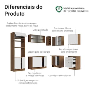 O acabamento de alta resistência da estrutura é em tom amadeirado Rustic, das frentes em Branco e possui uma textura suave ao toque. O destaque fica por conta dos puxadores ponto em ouro envelhecido, feitos com metal resistente, trazem personalidade e um charme único. Outro diferencial está no detalhe chanfrado das frentes, que forma molduras elegantes e dá profundidade ao design.