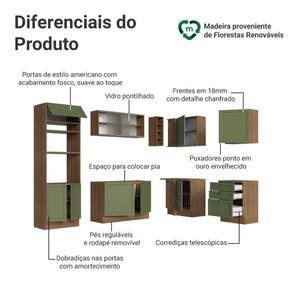 O acabamento de alta resistência da estrutura é em tom amadeirado Rustic, das frentes em Verde e possui uma textura suave ao toque. O destaque fica por conta dos puxadores ponto em ouro envelhecido, feitos com metal resistente, trazem personalidade e um charme único. Outro diferencial está no detalhe chanfrado das frentes, que forma molduras elegantes e dá profundidade ao design.