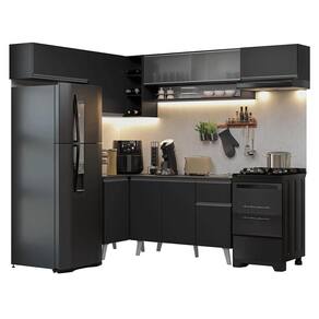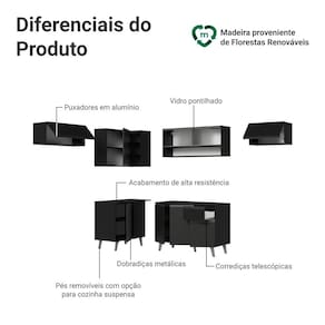 O acabamento de alta resistência no tom preto garante um visual moderno e sofisticado à cozinha. Os puxadores em cinza titanium valorizam ainda mais o ambiente.