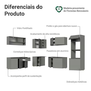 A linha Nice se diferencia por ser suspensa, acompanhando ferragens para fixação. O acabamento de alta resistência em cinza e os puxadores em alumínio reforçam o visual moderno, enquanto as corrediças proporcionam abertura total das gavetas. Os balcões acompanham tampo, garantindo praticidade.