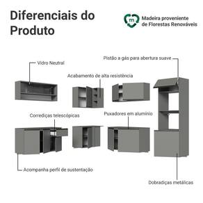 A linha Nice se diferencia por ser suspensa, acompanhando ferragens para fixação. O acabamento de alta resistência em cinza e os puxadores em alumínio reforçam o visual moderno, enquanto as corrediças proporcionam abertura total das gavetas. Os balcões acompanham tampo, garantindo praticidade.