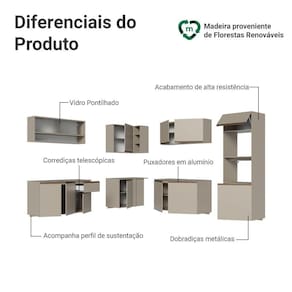 A linha Nice se diferencia por ser suspensa, acompanhando ferragens para fixação. O acabamento de alta resistência no tom crema e os puxadores em bronze metalizado reforçam o visual elegante, enquanto as corrediças proporcionam abertura total das gavetas. Os balcões acompanham tampo, garantindo praticidade.