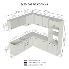 Possui puxadores com alça em alumínio, corrediças telescópicas nas gavetas e amortecedores para o fechamento suave das portas. Além disso, conta com pistão a gás na porta basculante e pés reguláveis em PVC, com rodapé removível em MDP de fácil encaixe.