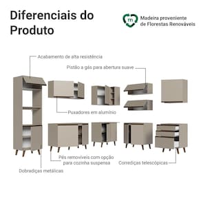 Produzido com materiais de qualidade, o balcão conta com dobradiças metálicas nas portas e puxadores em perfil de alumínio, discretos e resistentes. O tampo é removível, o que permite a instalação de cuba ou pedra. O acabamento é de alta resistência, garantindo durabilidade no uso diário.