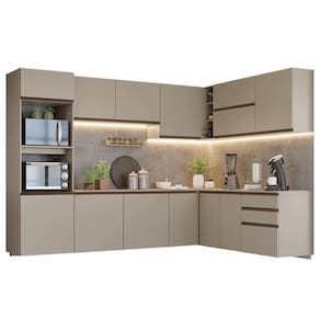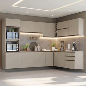 Com layout planejado e módulos bem distribuídos, essa cozinha facilita seu dia a dia. Os módulos de canto otimizam o espaço e a instalação suspensa dá um visual moderno e facilita a limpeza.