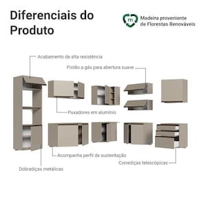 Produzido com materiais de qualidade, o balcão conta com dobradiças metálicas nas portas e puxadores em perfil de alumínio, discretos e resistentes. O tampo é removível, o que permite a instalação de cuba ou pedra. O acabamento é de alta resistência, garantindo durabilidade no uso diário.