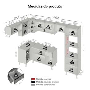 O espaço interno e externo do móvel é amplo. Acomoda de maneira organizada louças, eletros e utensílios, mantendo sua cozinha sempre arrumada.
