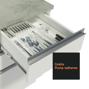 A fabricação é feita com itens de alta qualidade, como puxadores em alumínio, gavetas com corrediças telescópicas, portas com amortecedores para o fechamento suave e pés reguláveis em PVC e rodapé removível em MDP.