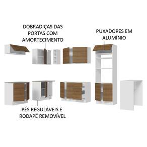 Composta por materiais de qualidade e pensados para garantir durabilidade, a cozinha conta com puxadores em alumínio no modelo slim, gavetas com corrediças telescópicas de abertura total e as portas com amortecimento para fechamento suave.