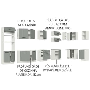 O primeiro destaque é a fabricação com itens de alta qualidade. Conta com puxadores com alça em alumínio, gavetas com corrediças telescópicas de abertura total, portas com amortecimento para fechamento suave, pistão a gás nas portas basculantes e pés reguláveis em PVC, com rodapé removível em MDP.