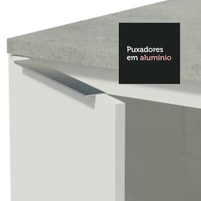 Além disso, o armário conta vários detalhes que aumentam sua vida útil e tornam seu uso mais confortável. Possui puxadores em alumínio, gavetas com corrediças telescópicas e portas com amortecimento. Conta ainda com pés reguláveis em PVC e rodapé removível em MDP.