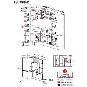 Altura: 203cm | Largura: 152 x 234cm | Profundidade: 32cm (aéreos e paneleiro) - 53cm (balcão com tampo e torre quente)