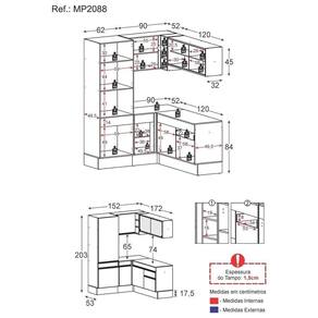 Dimensões do produto montado: Altura: 203cm | Largura: 152 x 172cm | Profundidade: 32cm (aéreos) - 53cm (balcão com tampo e paneleiro) *Você pode consultar as medidas internas na imagem técnica do produto. *As cores do produto podem sofrer variações de tonalidade de acordo com as configurações do seu dispositivo.