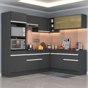 A Cozinha Completa de Canto com Rodapé Veneza Multimóveis MP2099 com Armário e Balcão tem um excelente custo benefício e um amplo espaço interno. Produzida em MDP com acabamento acetinado (cerca de 20% de brilho), que garante maior durabilidade e resistência, possui corrediças metálicas (mais leveza no manuseio), rodapés, que deixam o ambiente mais estiloso, puxadores em ABS e tampo em MDP 15mm com pintura de alta resistência. Os módulos de canto podem ser montados dos dois lados (esquerdo ou direito), conforme a sua preferência. Esta cozinha conta, ainda, com balcão com tampo removível (compatível com pia de 120 cm), com 1 gaveta e 2 portas e balcão para cooktop (o recorte do tampo deve ser realizado na hora da montagem conforme a medida do seu fogão) com 1 gaveta e 1 porta. Os módulos são individuais e você pode montar da maneira que se adaptar melhor ao seu ambiente. Para deixar sua cozinha mais bonita e organizada, possui vidro reflecta, espaço para forno e microondas e compartimento especial para utensílios mais altos.