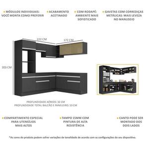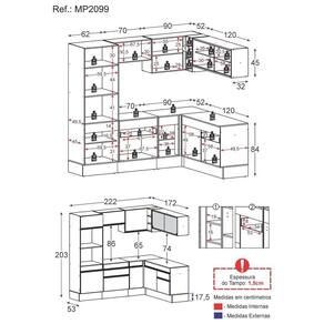 Altura: 203cm | Largura: 222 x 172cm | Profundidade: 32cm (aéreos) - 53cm (balcão com tampo e paneleiro)