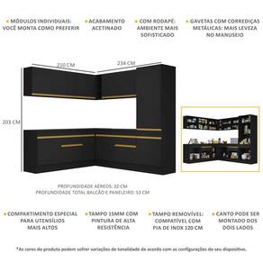 Altura: 203cm | Largura: 210 x 234cm | Profundidade: 32cm (aéreos) - 53cm (balcão com tampo e paneleiro)