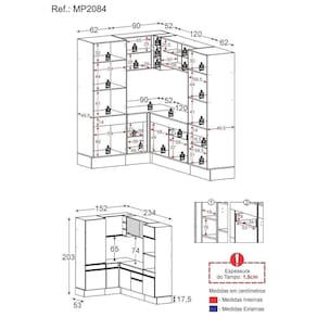 Dimensões do produto montado: Altura: 203cm | Largura: 152 x 234cm | Profundidade: 32cm (aéreos) - 53cm (balcão com tampo e paneleiro) *Você pode consultar as medidas internas na imagem técnica do produto. *As cores do produto podem sofrer variações de tonalidade de acordo com as configurações do seu dispositivo.