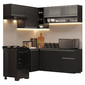 O acabamento de alta resistência no tom preto confere um visual moderno e sofisticado à cozinha. Os puxadores em cinza titanium valorizam ainda mais o ambiente.